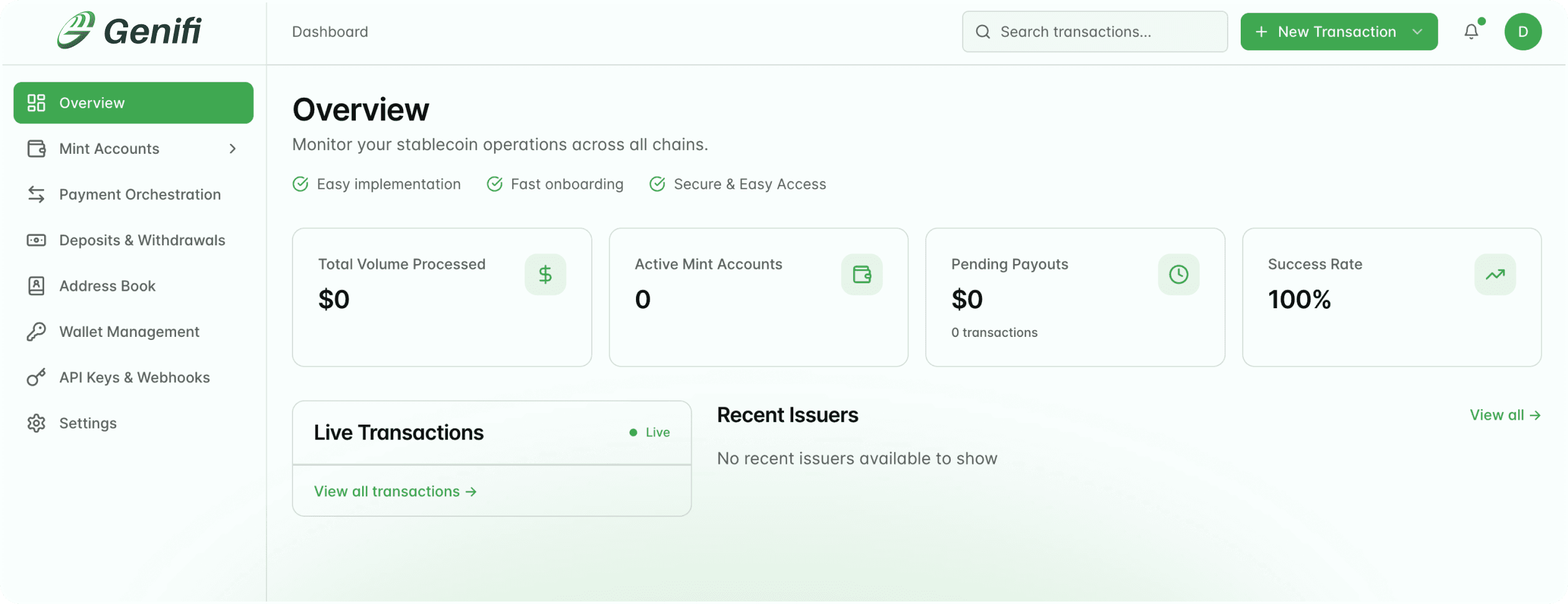 Genifi is agentic stablecoin infrastructure. We provide a single API layer for minting, payments, FX, Fiat Pay-ins & Payouts, and settlement across stablecoin issuers, regional banking rails, and blockchain networks. We serve a wide range of enterprises, such as Fintechs, Neobanks, PSPs, and exchanges with plug-and-play stablecoin and global fiat solutions.
