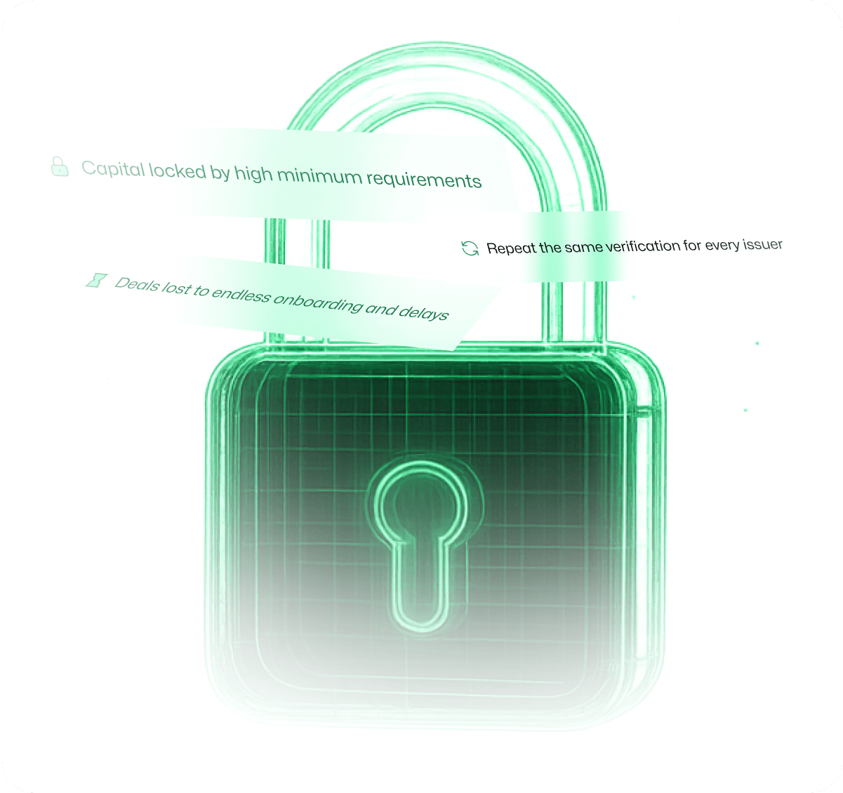 Every issuer demands its own KYC/KYB, high minimums, and inefficient fiat onboarding — wasting time, locking funds, and killing opportunities.